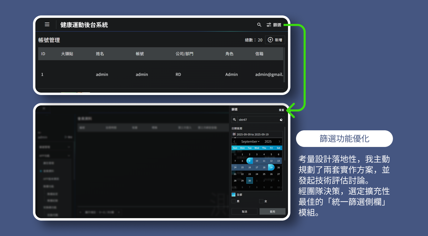 各頁獨立按鈕)並發起技術評估。經與工程師討論後,選定擴充性最佳的「統一篩選側欄」模組。