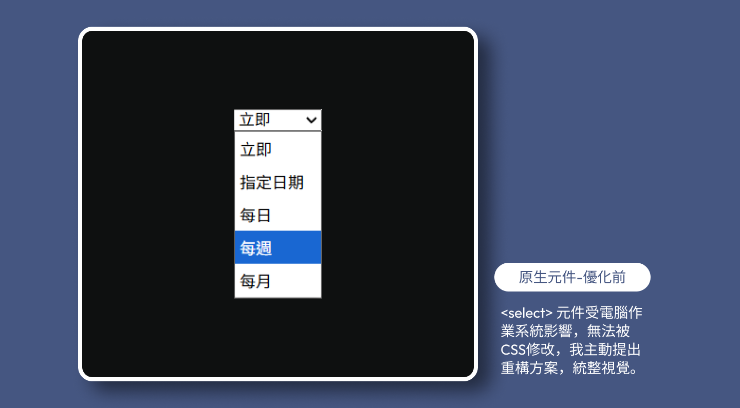 主動與工程師溝通後,我摒棄原生標籤,使用重寫了符合 Design System 的下拉選單結構。