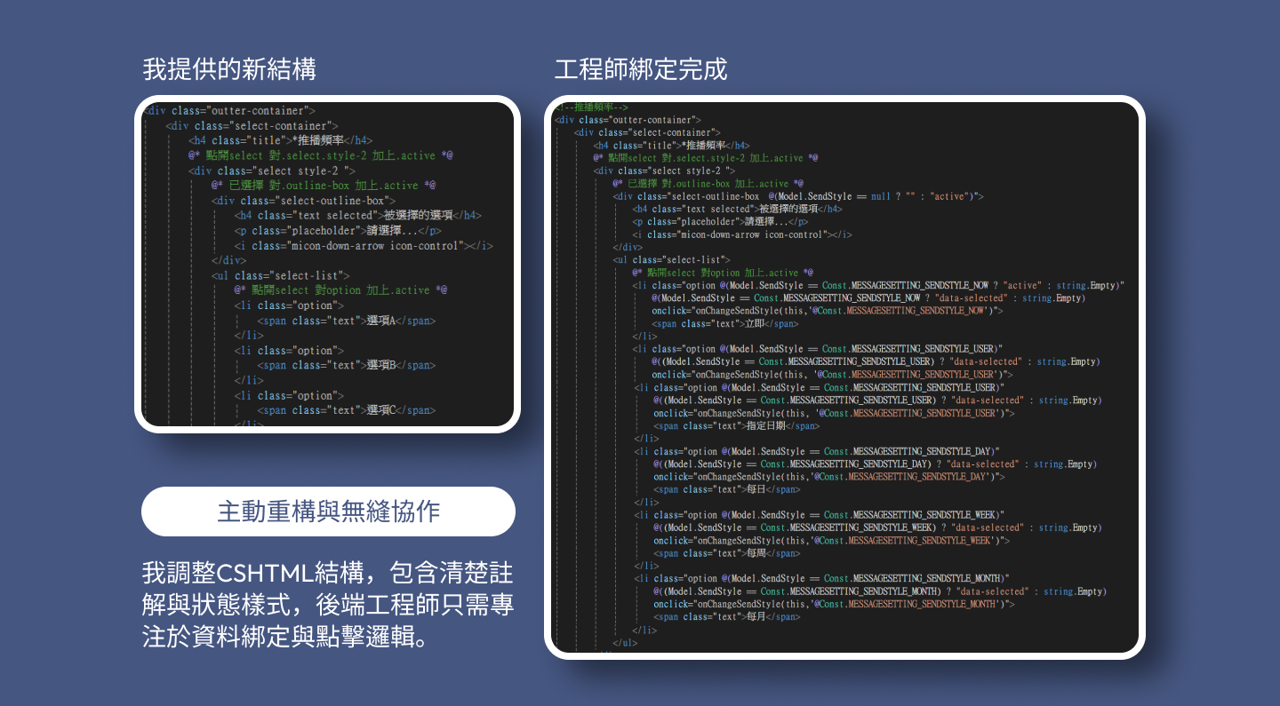 在此標準化流程下,我直接掌管專案的視覺層代碼,確保「設計語言」與「程式語言」的無縫接軌。